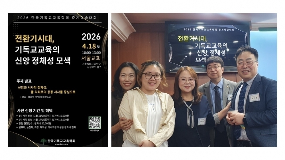 한국 기독교 교육 학회 춘계 학술대회 참석한국 기독교 교육 학회에서 주최한 춘계 학술대회에 참석하여 신학적 연구와 학문적 교류의 시간을 가졌습니다. 기독교 교육의 신앙 정체성을 모색하고, 한국 교회의 현재와 미래를 조망하며, 학문적 통찰을 넓히는 기회를 가지고 왔습니다. 앞으로도 지속적인 연구와 학문적 교류를 해 나갈 수 있도록 기도와 관심으로 함께해 주시기 바랍니다. 이와 관련하여 [기독일보], [CTS 교계 뉴스]에 실린 내용을 링크해 드립니다. https://www.christiandaily.co.kr/news/158786 https://www.youtube.com/watch?app=desktop&v=lBmEFxt2XRs&ra=m |