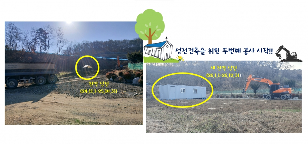 하나님의 은혜 가운데 새 성전을 위한 성막 공사가 순조롭게 진행되고 있습니다.컨테이너 설치 작업이 이루어졌으며,
