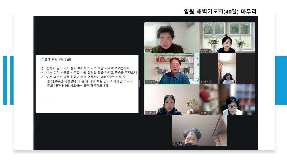 총회 임원회 [40일 새벽 기도회]를 하나님의 은혜로 잘 마쳤습니다. (1/5-3/23)그동안 중앙 선교회는 하나님의 뜻대로 성장하는 총회가 되게 해 달라고 기도해 왔습니다.