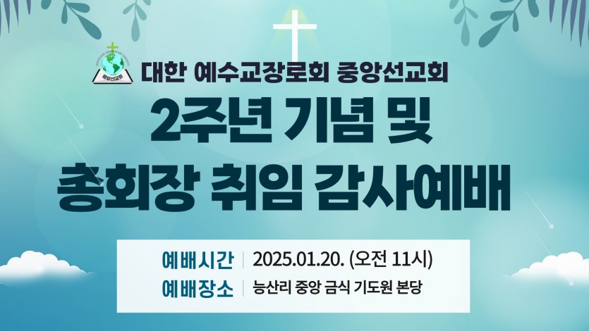 목록 2주년 기념 및 총회장 취임 감사예배 페이지 정보 작성자 중앙월드미션 댓글 0건 조회 603회 작성일 25.01.07 본문 2주년 기념 및 총회장 취임 감사예배를 아래와 같이 주최하오니많은 참석을 부탁드립니다.일시: 2025년 1월 20일(오전11시)장소: 능산리 중앙 금식 기도원(본당)주소: 주소: 충북 음성군 금율로 389번길97-41(소독차단기를 지나서 직진) 스크랩 +0 이전글 미라클 제너레이션 영성훈련(6차) 25.01.24 목록 다음글 300일 성전 건축을 위한 기도회 25.01.06 댓글 0 댓글목록 등록된 댓글이 없습니다.