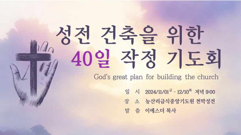 능산리 금식중앙기도원 "성전 건축을 위한 40일 작정 기도회"를 시작하려고 합니다.