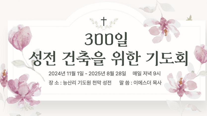 목록 300일 성전 건축을 위한 기도회 페이지 정보 작성자 중앙월드미션 댓글 0건 조회 448회 작성일 25.01.06 본문 "성전 건축을 위한 기도회는 300일 까지 계속 진행됩니다.마음을 모아 함께 기도할 때 주님은 일하여 주십니다.일시: 2024년11월1일(금)-2025년8월28일(목) 저녁 9시말씀: 이에스더 목사장소: 능산리 기도원 천막 성전 이전글 2주년 기념 및 총회장 취임 감사예배 25.01.07 목록 다음글 2025년 신년 대부흥성회 25.01.06 댓글 0 댓글목록 등록된 댓글이 없습니다.